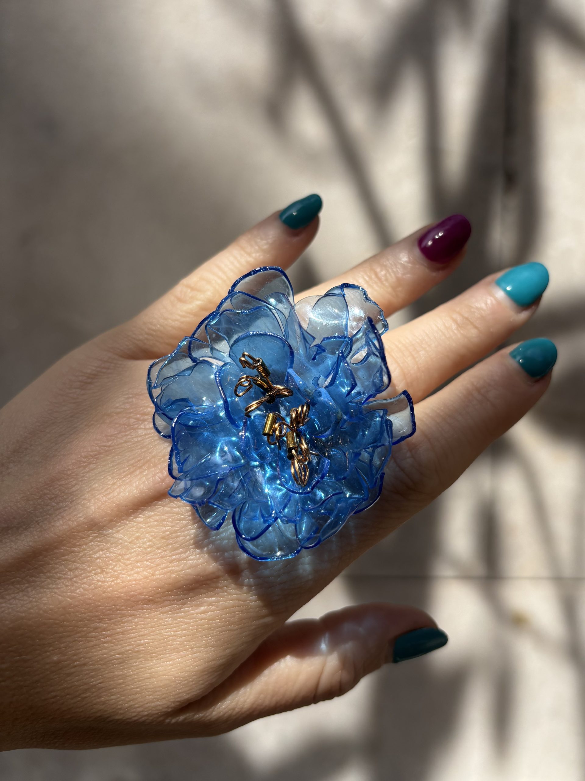 Anillo hecho a mano con plásticos 100% reciclados. Montado sobre hilo de cobre o acero inoxidable. Pieza liviana, cómoda y altamente resistente.
